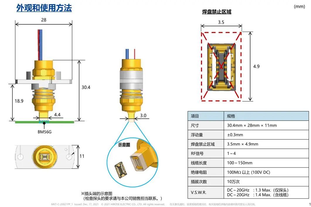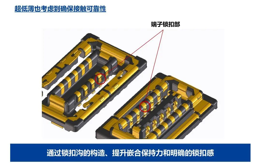 尺寸 省空间 防燥对策 RF特性(连接器单体) RF特性(连接器+FPC) 牢固构造 端子锁扣构造 通过金属诱导实现了较大的自校正量